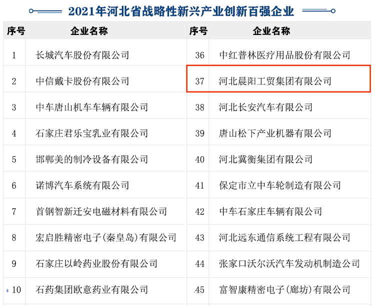 河北晨陽工貿集團榮膺“2021年河北省戰略性新興產業創新企業百強”